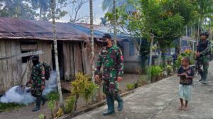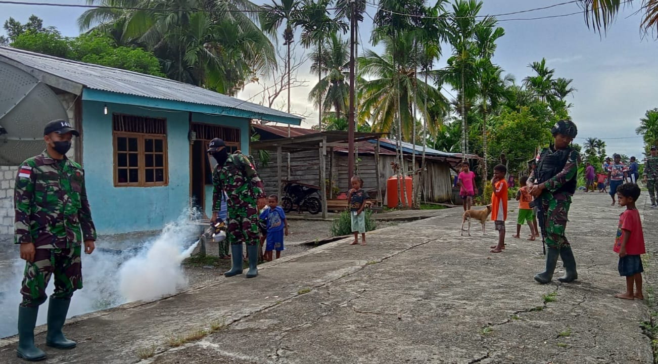 Mangrove.id| Satgas Pamtas RI-PNG Yonif 143 laksanakan Karya Bakti berupa Fogging ( Pengasapan ) untuk memutus mata rantai perkembangbiakan nyamuk Malaria di Kampung Warlef, Distrik Senggi, Kabupaten Keerom, Papua. Kamis (16/11/2022 ).