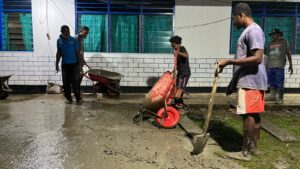 TELUK BINTUNI, mangrove.id| Warga jemaat GKI Ebenhaezer Sigerau, Klasis Teluk Bintuni bergotong royong mengecor halaman gereja, Senin (10/11).