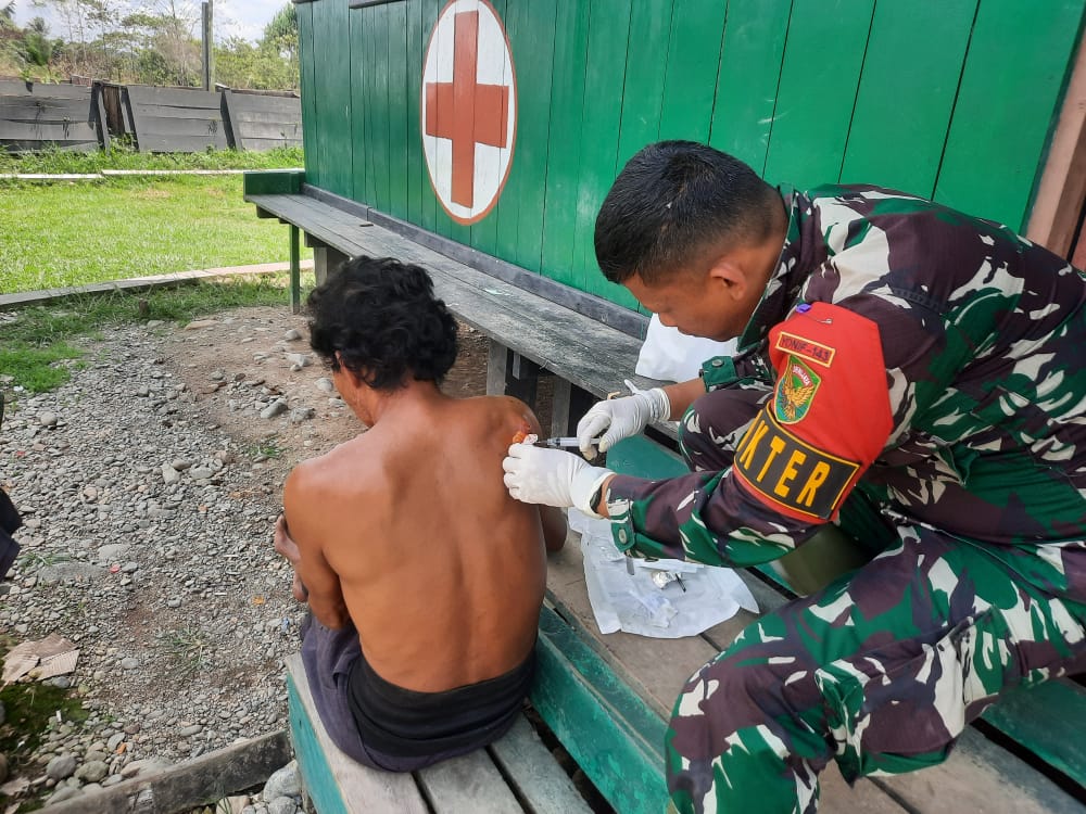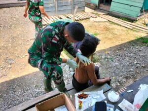 Mangrove.id| Prajurit TNI dari Satgas Yonif 143/TWEJ mengobati warga Trans SP 2 Distrik Senggi, Kabupaten Keerom, Papua yang mengalami luka benjolan nanah dipunggungnya, Rabu (02/11/2022).