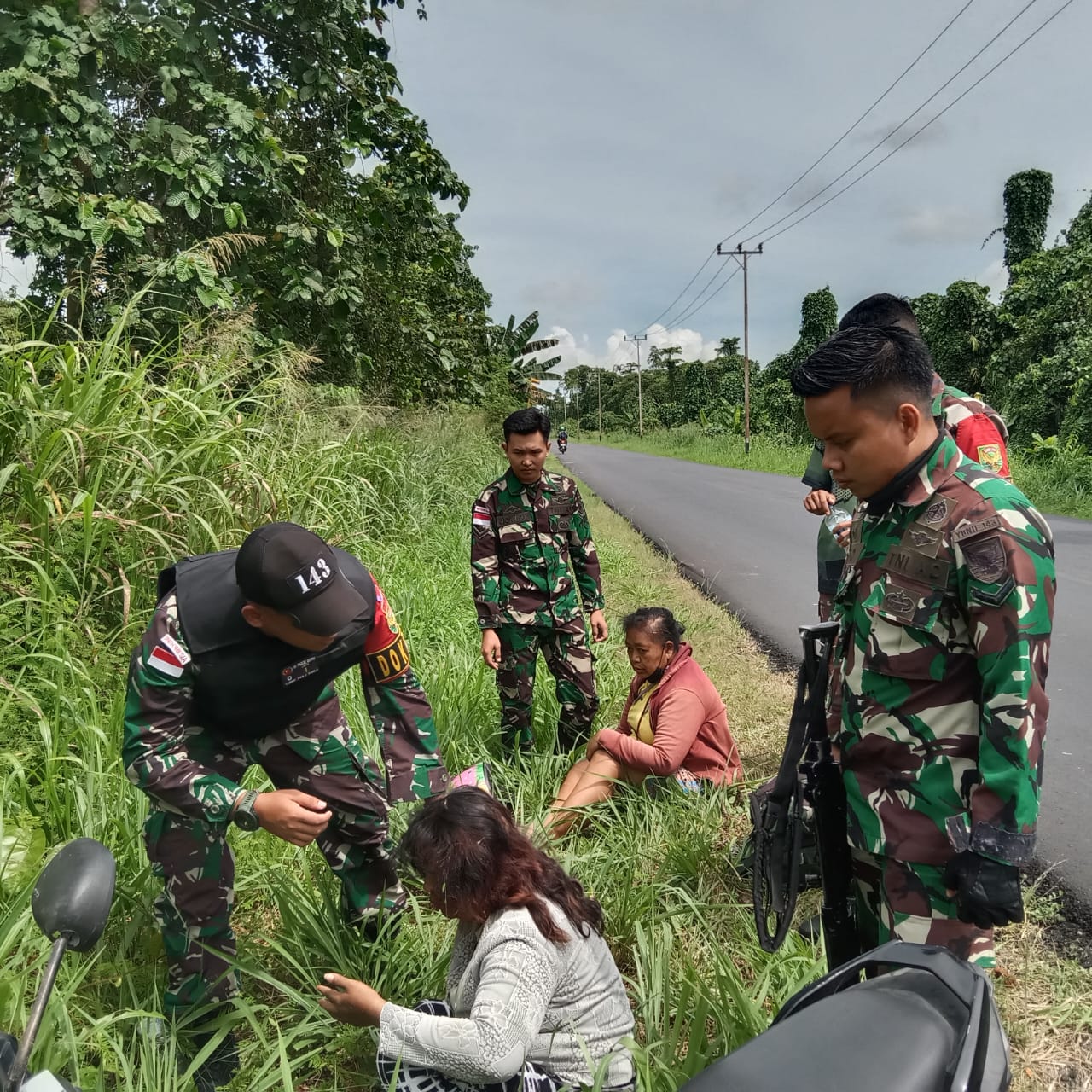Lettu Inf Bekti Handoko selaku Pasiter Satgas 143/TWEJ. didampingi Letda Ckm dr. Made Banupati saat melintas di Jalan Trans Papua menjumpai dua orang ibu tergeletak alami kecelakaan di pinggir jalan yang jauh dari perkampungan.