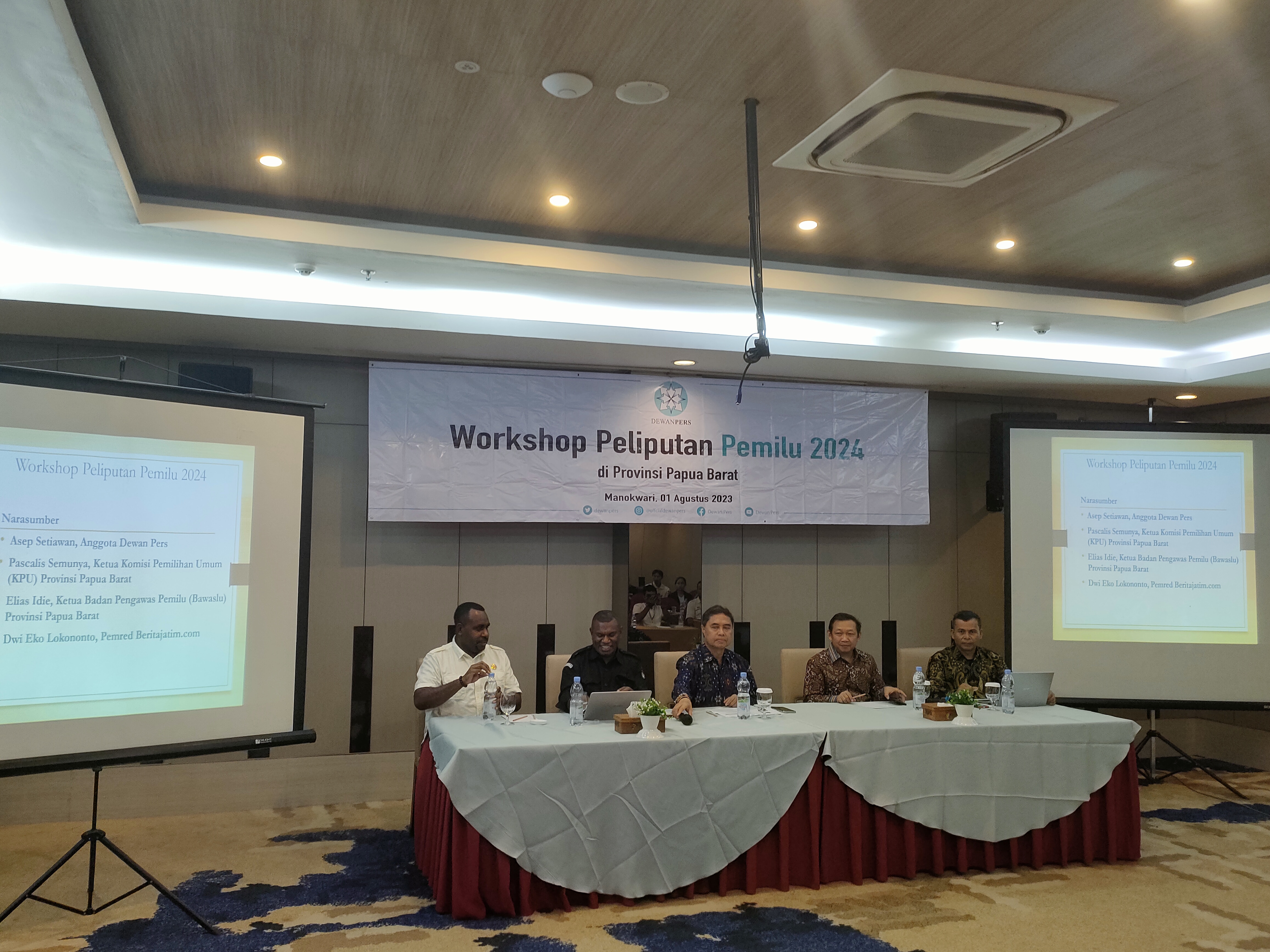 Turut hadir sebagai pembicara dalam workshop pemilu 2024, Ketua KPU Papua Barat Pacalis Semuanya, Ketua Bawaslu PB Elias Idie, serta pimpinan redaksi Beritajatim.com Dwi Eko Lokononto.(Kev)