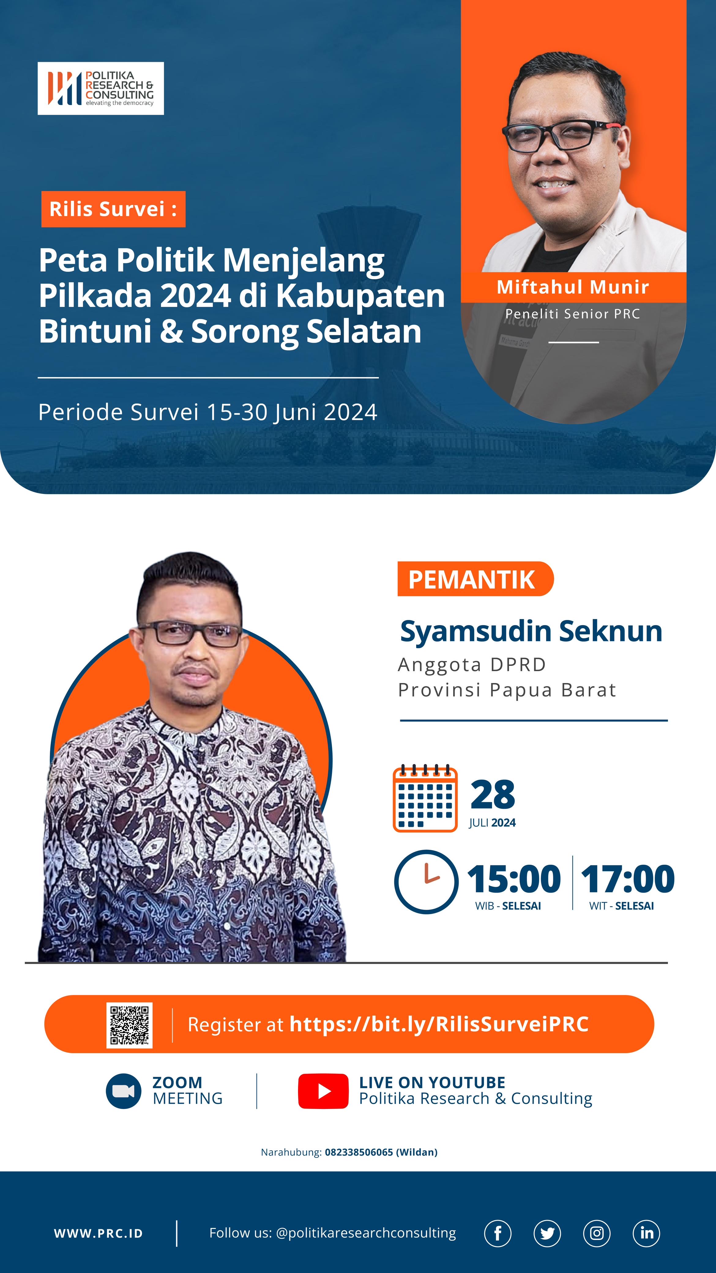 Politika Research and Consulting (PRC) akan menjabarkan beberapa temuan dalam Rilis Survei: Peta Politik Menjelang Pilkada 2024 di Kabupaten Bintuni & Sorong Selatan. Survei dilakukan secara tatap muka pada periode survei 15-30 Juni 2024.
