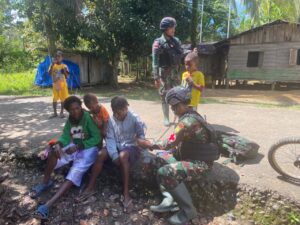 Mangrove.id| Personel Pos Yuruf Satgas Pamtas RI-PNG Yonif 143/TWEJ melaksanakan anjangsana ke fasilitas pendidikan, pelayanan kesehatan masyarakat serta membagikan pakaian layak pakai kepada warga kampung Yuruf, Distrik Yaffi, Kabupaten Keerom, Papua, Rabu (2/11/2022).