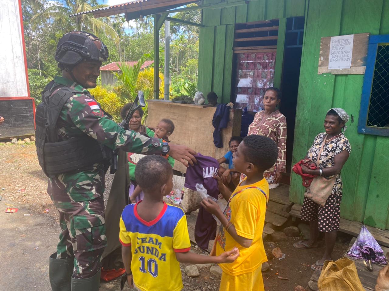 Tak hanya melayani orang sakit, Anggota TNI ini menyempatkan bermain dengan anak-anak sembari membagikan permen. Serta membagikan pakaian layak pakai kepada warga.