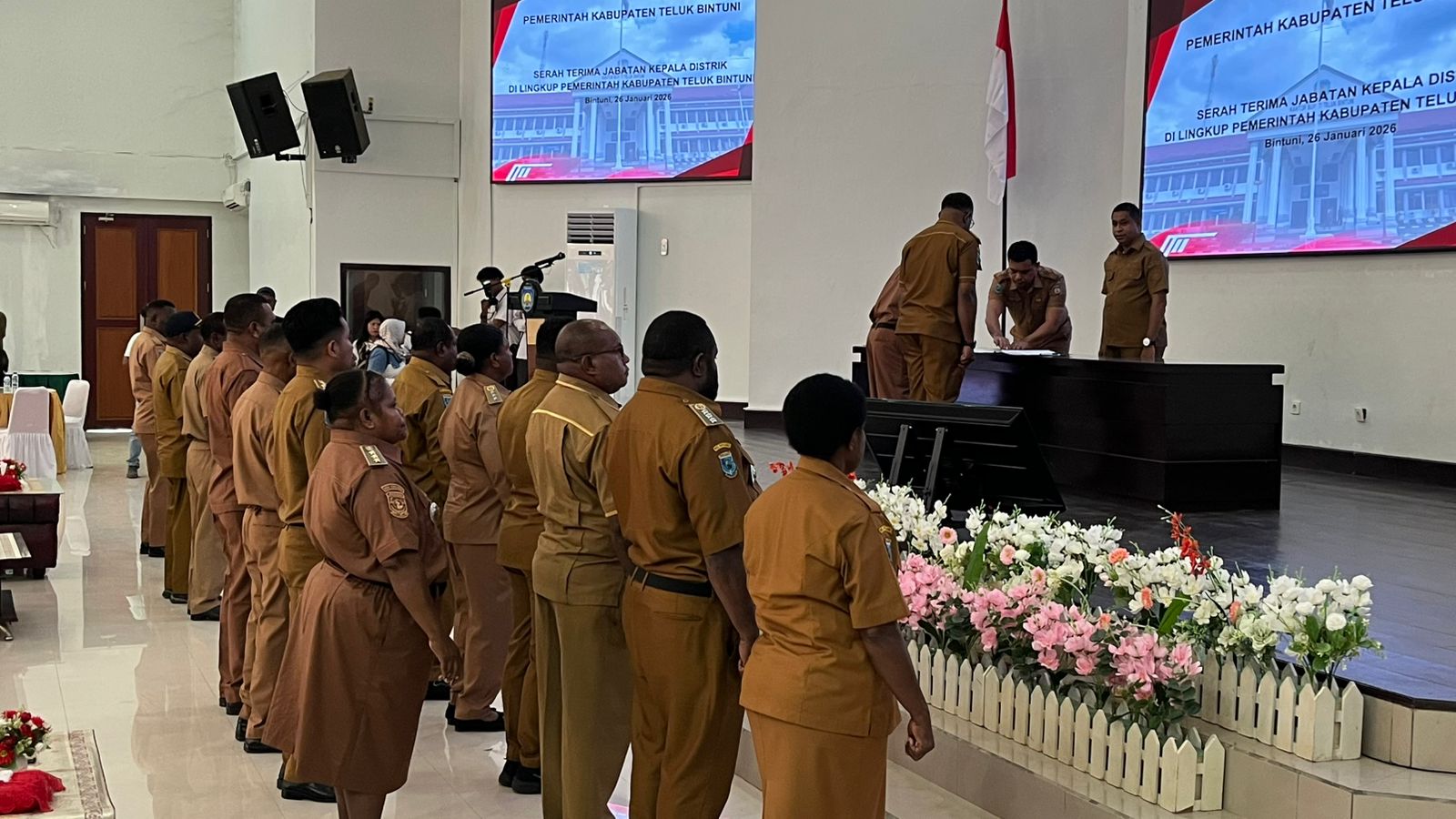 TELUK BINTUNI, mangrove.id| Bupati Teluk Bintuni, Yohanis Manibuy memimpin serah terima jabatan (Sertijab) 13 kepala Distrik di lingkup Pemerintah Kabupaten Teluk Bintuni. Mereka yang menjalani sertijab antara lain kepala Distrik Tomu, kepala Distrik Aranday, kepala Distrik Weriagar, kepala Distrik Kamundan dan kepala Distrik Aroba,